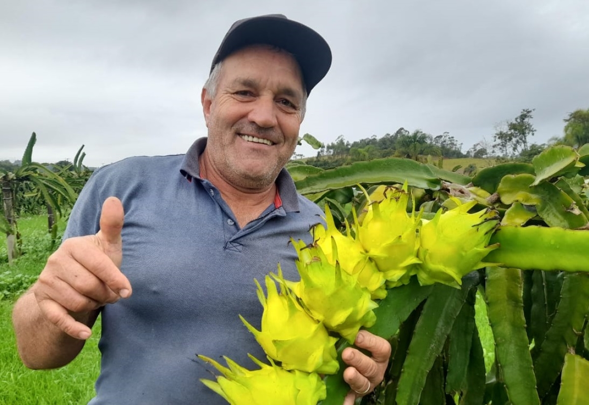O que ele mais gosta é cultivar frutas de um modo geral, em sua propriedade tem muitas opções, dentre elas: líchias, cítricos diversos, pêssegos, ameixas, bananas, atemóia, uvas, abacates, jabuticaba, grumixama, porém o que mais vem cultivando é a pitaya, que iniciou como um hobby e tomou grande proporção.