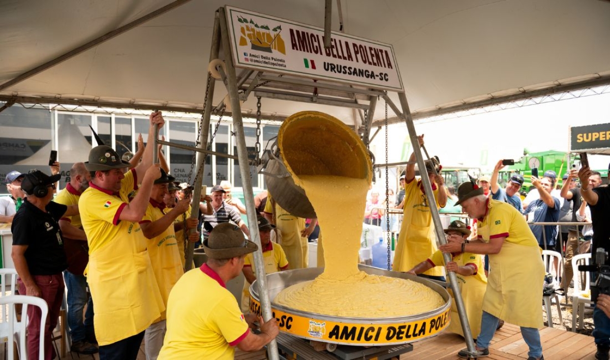 Ao meio-dia, pela primeira vez o evento recebeu o tradicional Tombo da Polenta, com o grupo Amici della Polenta, de Urussanga, que deu um brilho especial ao evento. O público participou ativamente, cantou músicas italianas junto ao grupo e celebrou a tradição em um momento marcado por animação e muito sabor.