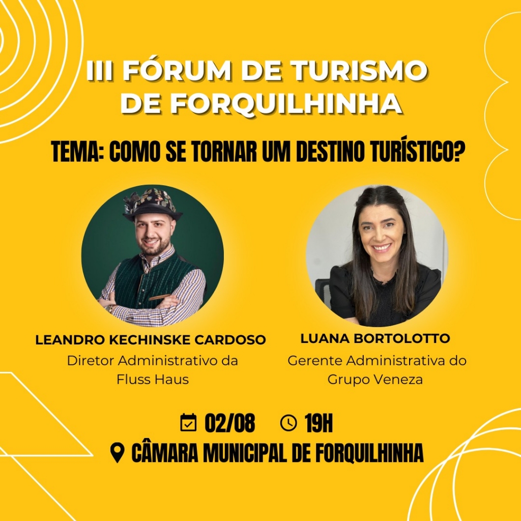 O aguardado III Fórum de Turismo de Forquilhinha promete uma noite repleta de oportunidades para os entusiastas do setor. O evento será realizado nesta quarta-feira, dia 02 de agosto, a partir das 19h, na Câmara Municipal da cidade e contará com a participação de destacados profissionais da área, além de representantes da Sociedade Civil, que debaterão as perspectivas e desafios do turismo local. O evento terá como tema “ Como se tornar um destino turístico”.