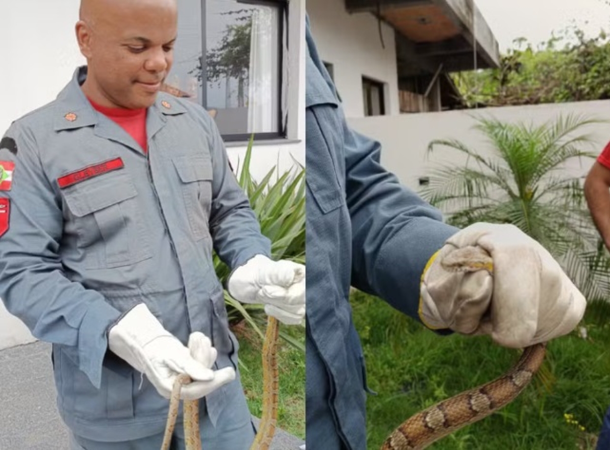 Uma corn snake, ou cobra do milho, foi capturada no quintal de uma casa, nesta segunda-feira (4), em Florianópolis, após moradores chamarem o Corpo de Bombeiros. A espécie é considerada exótica, invasora e tem origem nos Estados Unidos.