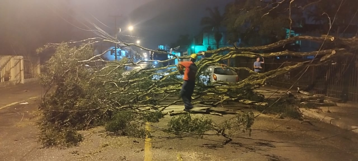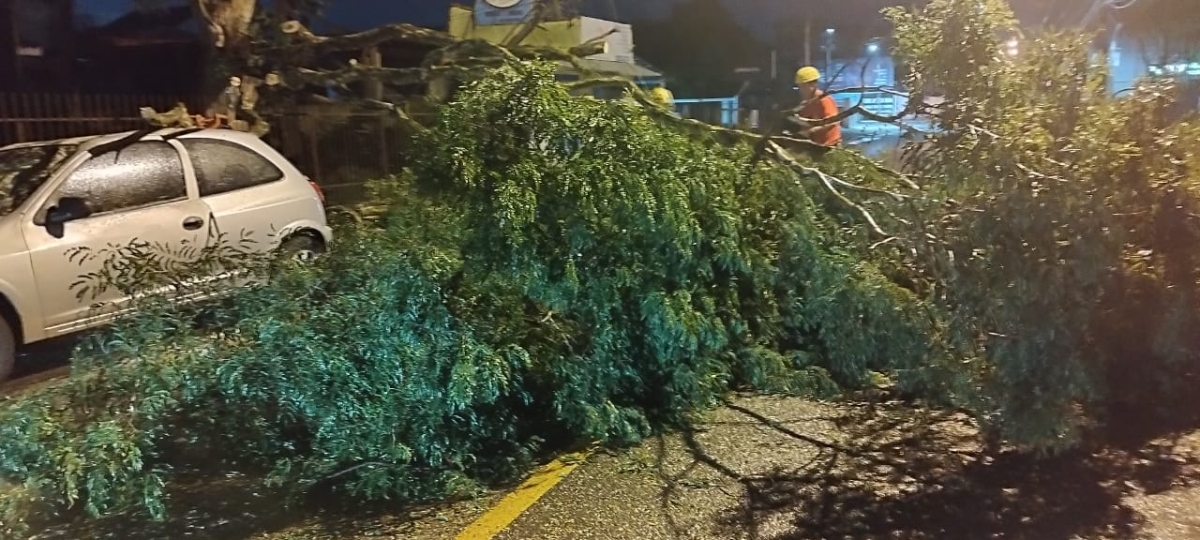 O forte vento registrado em Araranguá provocou a queda de uma árvore sobre um veículo Chevrolet Celta. A ocorrência foi registrada por volta das 23h40 dessa quinta-feira, dia 7, na rua Amaro José Pereira, no bairro Coloninha.