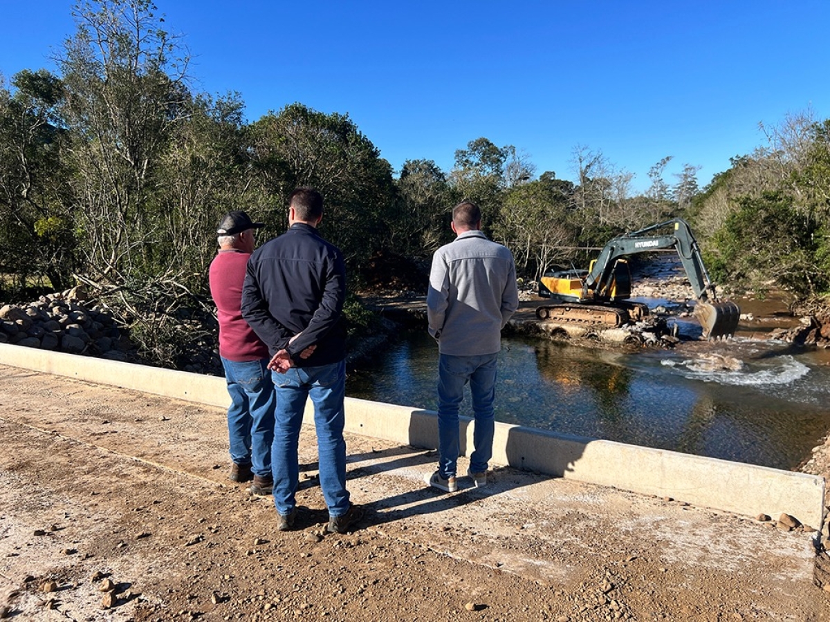 Prefeito Sander Just, acompanhado do secretário municipal de Obras, Valdir Furlaneto e do engenheiro do município, Bruno Nagel, acompanhou na tarde desta quarta-feira, 25 de junho, a remoção da antiga ponte molhada sobre o Rio das Pedras na comunidade de Costão da Pedra, interior de Jacinto Machado. A retirada da estrutura, substituída por uma ponte mais elevada, evitará o represamento das águas quando há aumento do fluxo.