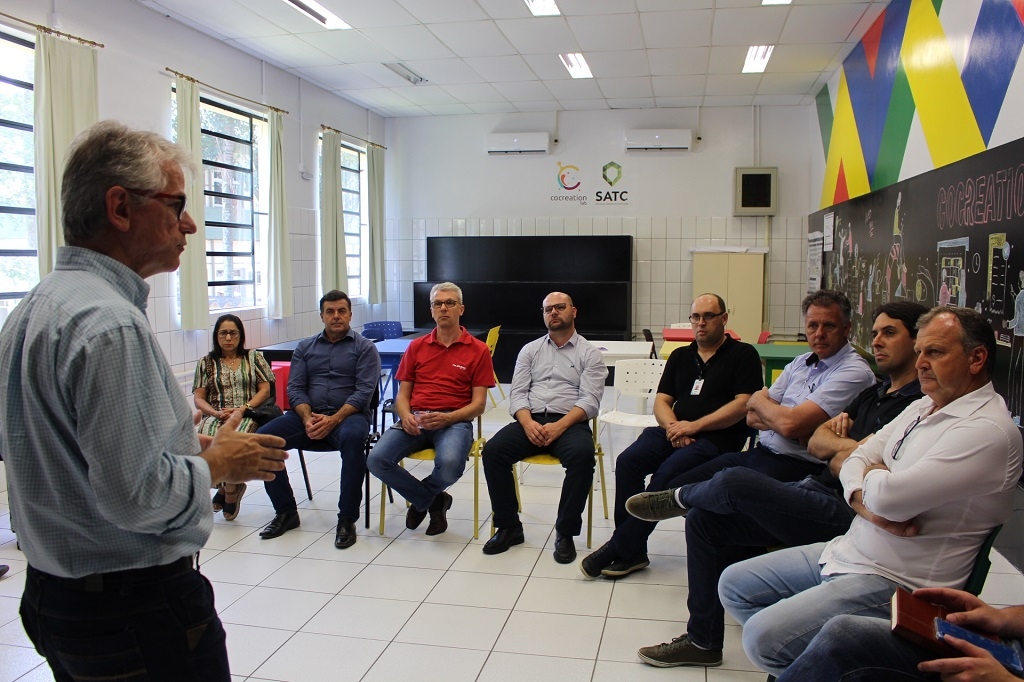 A visita começou no Cocreation Lab, onde o diretor geral da Satc, Carlos Antônio Ferreira apresentou a história e os eixos que envolvem a instituição. "Nós somos por natureza inquietos, a gente está sempre buscando coisas novas. Dentro da educação tem que inovar na hora de ensinar, nos currículos dos cursos, na forma como a gente entrega esse aluno para o mercado de trabalho", afirmou.