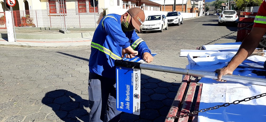 Para navegar nas ruas que desejamos ir, hoje é possível e muito fácil com qualquer programa que é acessado via um celular homologado com GPS , mas, nem todos tem essas instrumentos sempre em mãos. Mas, todas as ruas do mundo precisam e tem que ter uma identificação, ou seja, um nome ou código numeral. Os nomes de espaços públicos: ruas, praças, largos, memoriais e outros tem um nome, esses nomes são homenagens póstumas de pessoas gratas pela sua comunidade, município, estado ou país, que de qualquer forma deixaram bons legados e exemplos na historia, não importando a dimensão e sim as ações feitas. A sinalização de ruas através de placas que indicam o nome dela é um problema nacional, quem circula ou viaja sabe muito desses obstáculos. A turística Nova Veneza está sinalizando todas as ruas do município que ainda não possuíam identificação. Praticamente todas as esquinas estão sendo fixada uma placa padrão, que identifica o nome da rua, bairro, município, CEP e o brasão do município. Segundo o prefeito Rogério Frigo 400 placas, de imediato estamos colocando 350, e outras 50 serão ficará para repor placas danificadas e de novas ruas e praças. Todo recurso vem do governo municipal afirma o prefeito da capital mundial da Polenta. “Via de cuà via de la, senpre le nostre vie!!!”