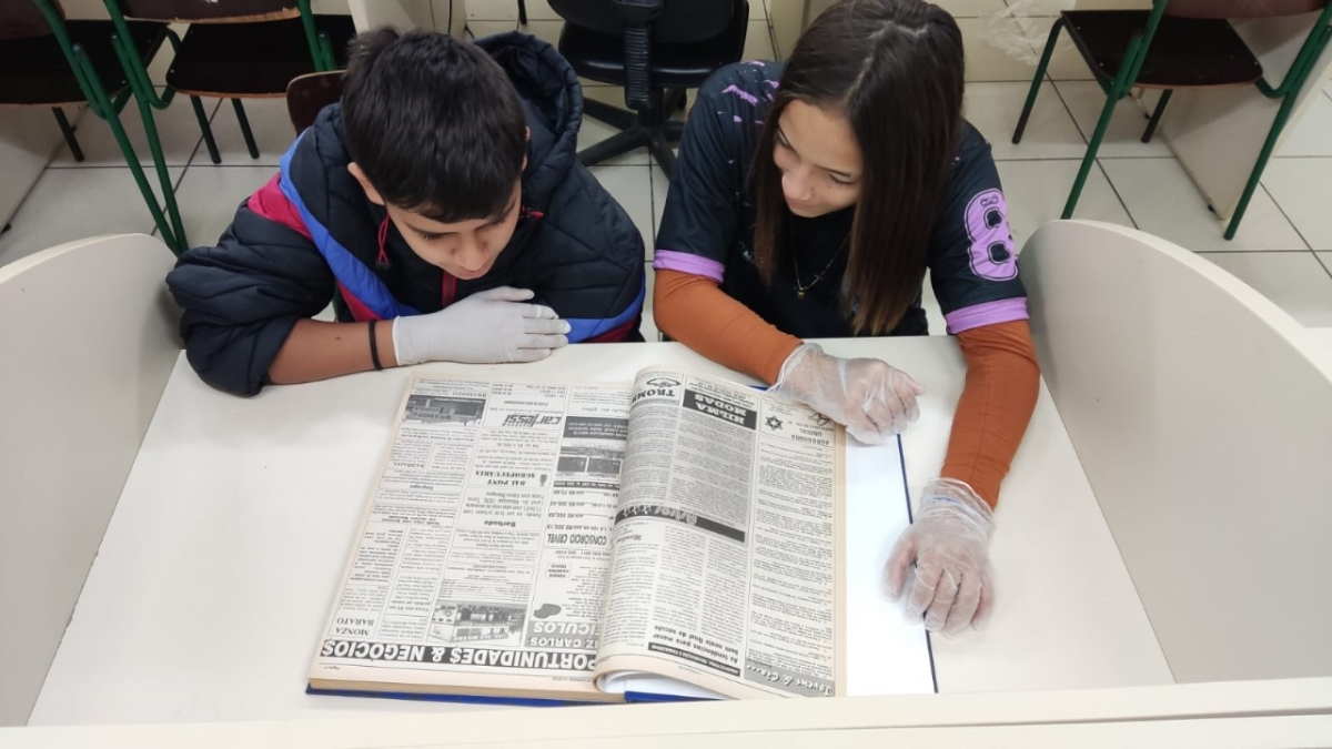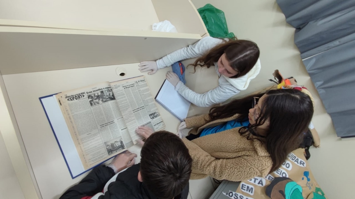 Os alunos do 8º e 9º anos da Escola de Ensino Fundamental Imaculada Conceição, localizada na Serra da Pedra, Jacinto Machado, tiveram uma aula de História especial. Eles participaram de uma oficina utilizando fontes primárias, especificamente edições antigas do Jornal Volta Grande.