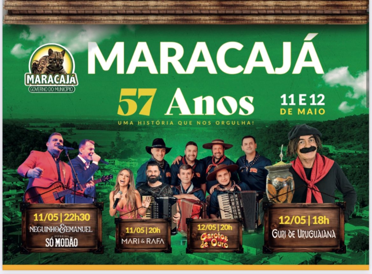 O município de Maracajá se prepara para a festa de 57 anos de Emancipação Político-Administrativa, que acontece de 10 a 12 de maio. A festa vem sendo preparada há meses e a programação conta com shows regionais, apresentações culturais, passeio ciclístico, parque infantil inflável, sorteio de bicicletas, homenagens para as mães, show humorístico e shows com bandas da região. No ano em que a cidade completa 57 anos, as festividades serão marcadas por três dias de atividades e entretenimento. A programação inclui diversas atrações, que acontecerão no Centro Esportivo Antônio da Rocha. A festa será marcada por grandes shows como: Neguinho & Emanuel – Especial Só Modão, show com Mari e Rafa, Garotos de Ouro e ainda show humorístico com Guri de Uruguaiana. O evento é aberto ao público, e todos os shows são gratuitos.