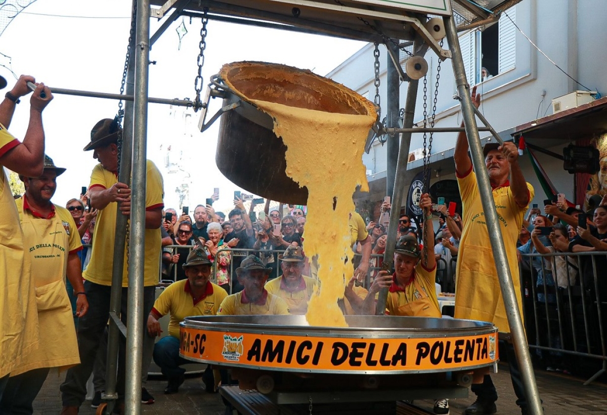 A tradicional Festa da Gastronomia de Nova Veneza, realizada neste final de semana, ganhou um destaque especial este ano com o "Tombo da Polenta", que já é uma atividade tradicional no sábado das festividades. O evento, que celebra o aniversário da cidade, está atraindo milhares de visitantes de diversas regiões do país, que estão apreciando a cultura, a culinária e tradições locais.