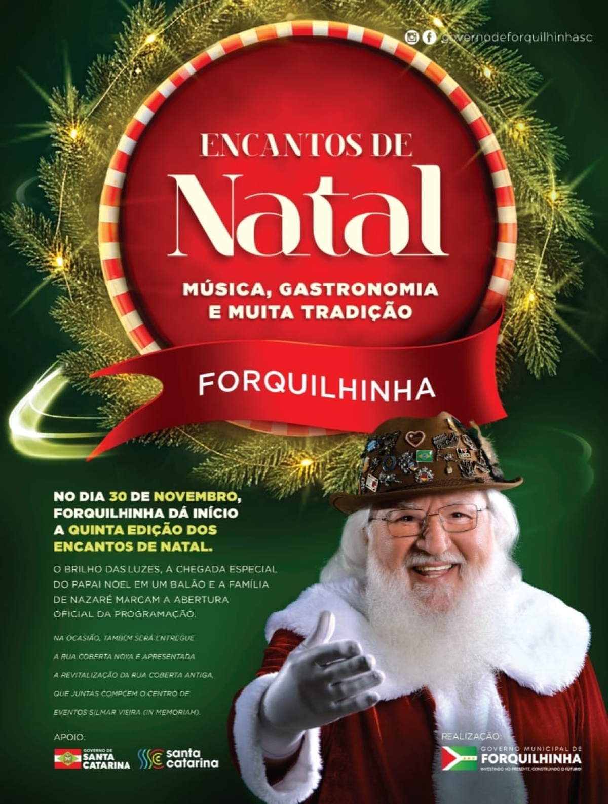 Forquilhinha está prestes a viver uma época inesquecível. No próximo dia 30 de novembro, às 19h, o Governo Municipal realiza a abertura oficial da quinta edição do Encantos de Natal. A noite marca o início da programação natalina da cidade, evento que todos os anos transforma o município em um cenário de luzes, magia e celebração. Somado a isso, a cidade recebe também um presente muito especial: a entrega oficial do Centro de Eventos Silmar Vieira, o novo complexo urbano que integra as duas ruas cobertas do centro da cidade.
