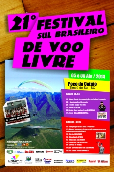 Será neste fim de semana uma das festas mais tradicionais do voo livre no Sul do Brasil. Na sua 21ª edição, o Festival Sul Brasileiro de Voo Livre trará diversos adoradores da prática do voo e shows nacionais. Com organização da família Paz, o evento será realizado nos próximos sábado e domingo (05 e 06 de abril), no Balneário Poço do Caixão. A Secretaria Municipal de Turismo está realizando todo o apoio necessário para a realização do festival. “Aguardamos um bom público, pois muitas pessoas nos procuraram e mostraram interesse no evento e em competições. Será mais uma edição de grande público”, destacou o Secretário de Turismo, Gislael Floriano. O inicio do festival será realizado no sábado (05) a partir das 10:30hs, com competições de asa delta e parapente. A abertura oficial do evento será às 20hs tendo como atrações o desfile e escolha no 13º concurso Garota Vôo Livre. A partir das 22:30hs a festa fica por conta de Clip Som, Alex Ferrari e Banda Matusa. Já no domingo são retomadas as competições. O almoço será servido no local. “Ao comprar o ingresso do almoço na portaria para este dia, a pessoa ganha a entrada”, comentou um dos organizadores, Alexandre Paz. Como atrações da tarde, a partir das 13hs, haverá a apresentação do Musical Uirapurú, Banda Oficina, Alex Ribeiro e show com Cintia e Mateus. A entrega das premiações será iniciada às 17hs. Para finalizar o festival haverá show Nacional com Léo Santoro e banda Tomarock. O Balneário apresenta espaço com churrasqueiras, ambiente para acampamento, dentre outros benefícios típicos do evento. O passaporte antecipado para os dois dias de festa pode ser encontrado na Relojoaria e Ótica Lauro, em Timbé do Sul e Turvo, no valor de R$ 20,00.