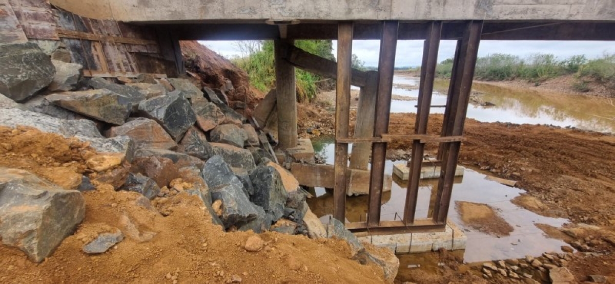 Agora as obras terão caráter definitivo. O pilar cedeu em função de fortes chuvas que atingiram a região em meados de junho deste ano, elevando muito o nível do rio e o volume de água que passava sob a estrutura.