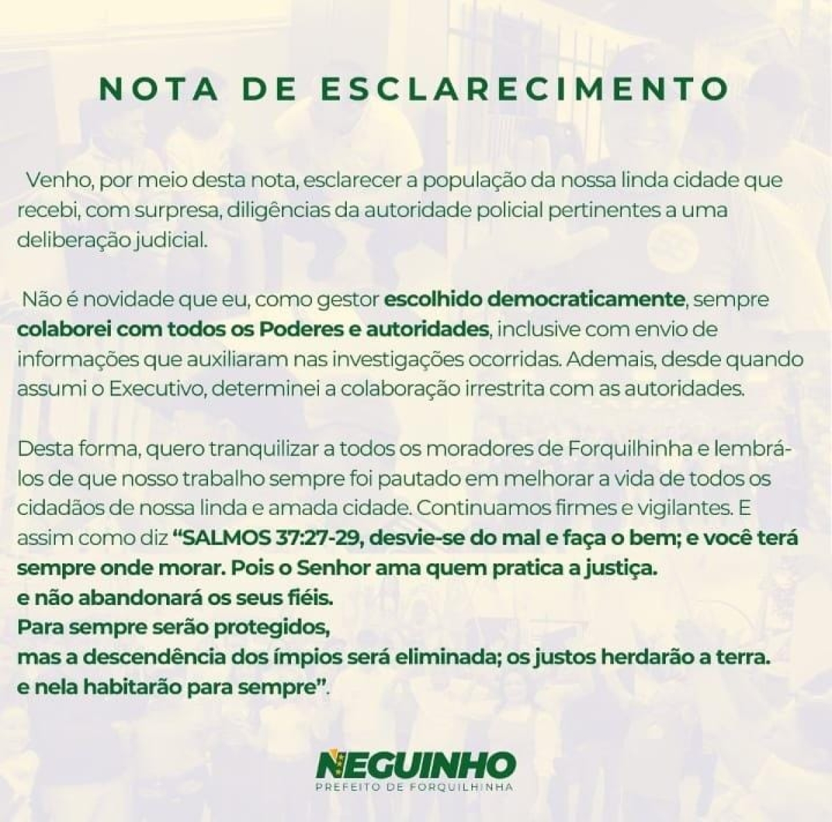 O Prefeito afastado emitiu uma nota em suas redes sociais. Acompanhe abaixo.