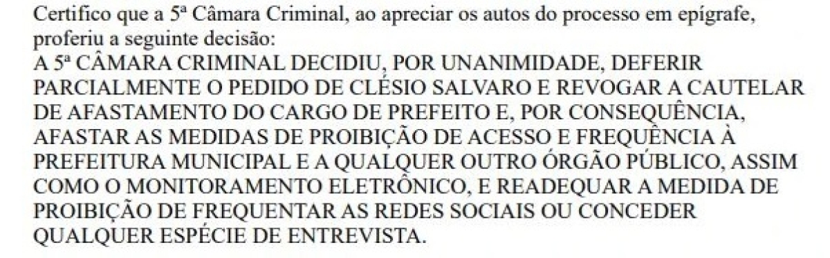 A 5ª Câmara Criminal do Tribunal de Justiça decidiu, por unanimidade, atender o pedido do prefeito Clésio Salvaro (PSD). Em sessão realizada nesta quinta-feira, dia 31, os desembargadores revogaram a cautelar que o afastava do cargo, permitindo seu retorno à administração municipal de Criciúma.