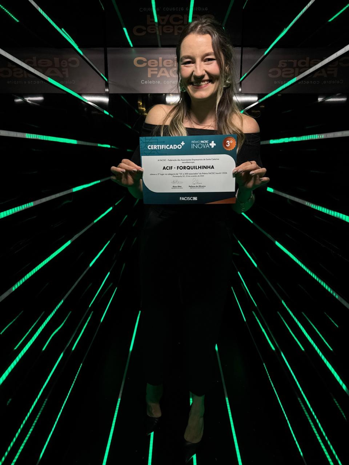 Na última sexta-feira dia 22 de novembro a ACIF celebrou mais uma conquista marcante para o associativismo local. Durante o evento celebra FACISC, a presidente Isa Arns, representando a atual gestão da entidade, recebeu o troféu de 3ª colocada no Prêmio FACISC Inova+, na categoria de associações empresariais com 150 a 300 associados.
