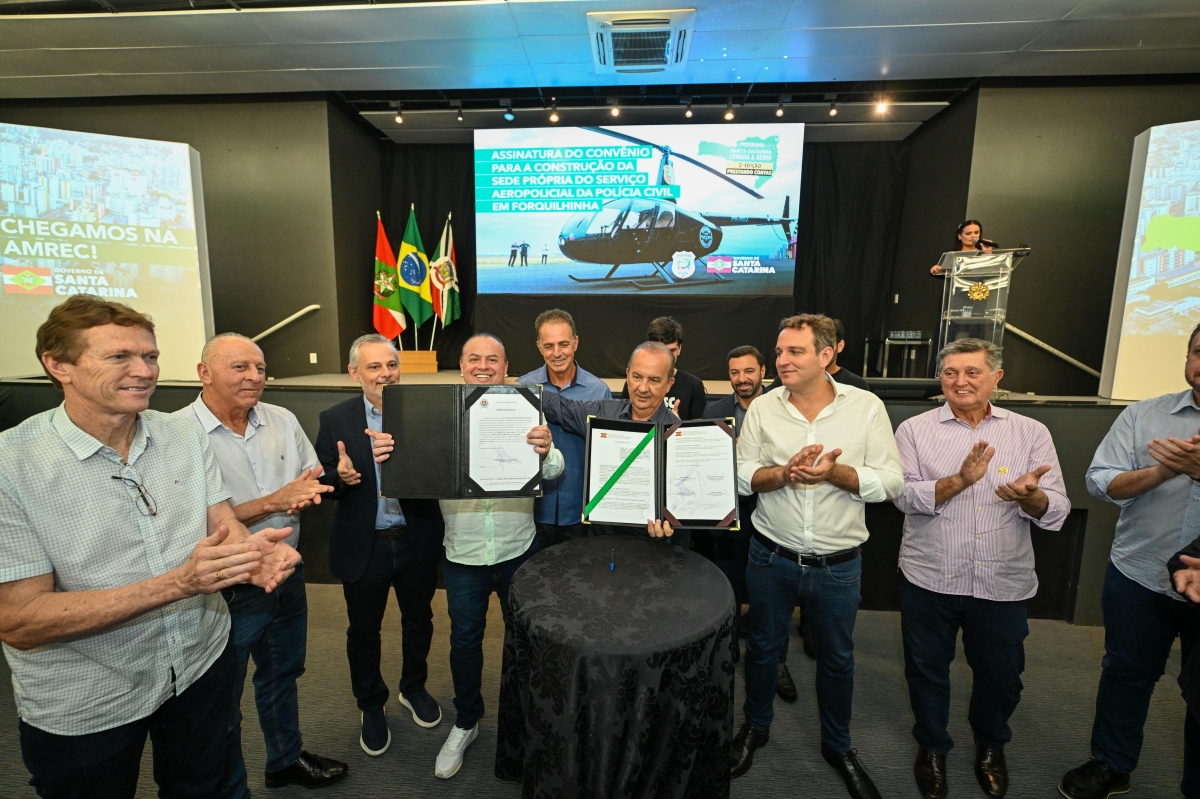 Além do detalhamento do programa, o governador realizou algumas entregas importantes, como a revitalização de delegacias, a inauguração de estradas e a construção de reservatórios de água, entre outras. Para Forquilhinha, foram entregues uma quadra poliesportiva para a Escola de Educação Básica Ângelo Izé e a ordem de serviço para a construção da nova sede do SAER SUL (Serviço Aeropolicial Sul), que será instalada no aeroporto Diomício Freitas.