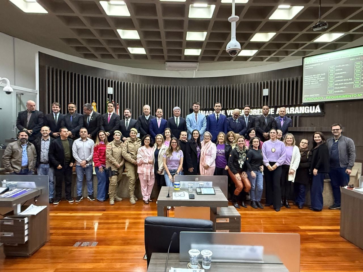 Na noite desta quarta-feira (6), durante a 38ª sessão ordinária da Câmara de Vereadores de Araranguá, foi lançada a Campanha Agosto Lilás, uma mobilização conjunta dos Poderes Executivo e Legislativo que marca o mês de conscientização pelo fim da violência contra a mulher. O evento contou com ampla participação de representantes da sociedade civil, entidades, imprensa e autoridades, unidas em um só propósito: combater todas as formas de violência de gênero.