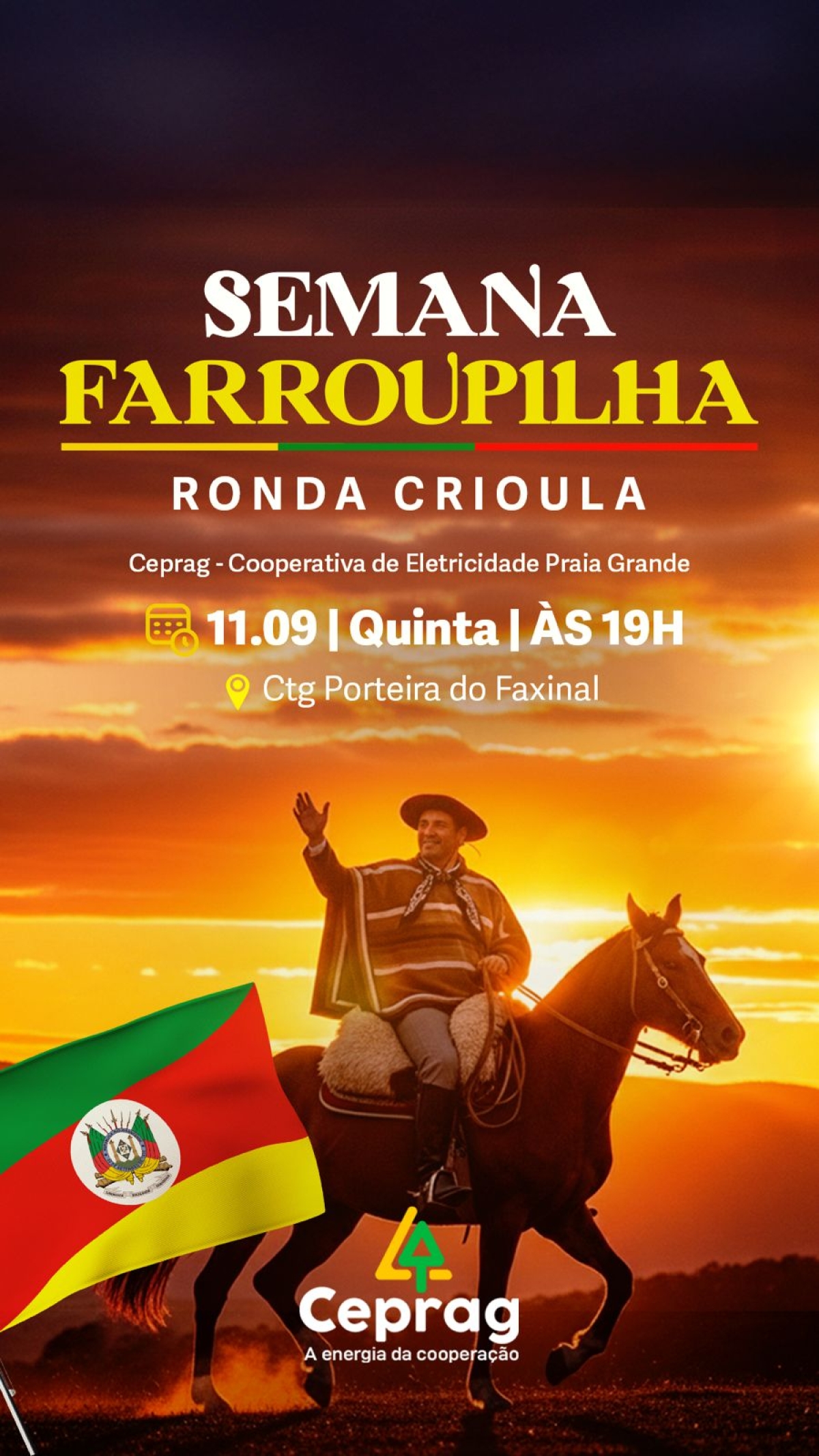 O evento, que conta com o apoio da Ceprag – Cooperativa de Eletricidade Praia Grande, promete reunir a comunidade em um momento de valorização da tradição gaúcha, celebrando a cultura, a história e os costumes que fazem parte da identidade regional.