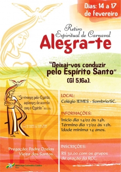 De 14 a 17 de fevereiro, cerca de 400 jovens das comarcas pastorais de Araranguá, Turvo e Santa Rosa do Sul estarão reunidos no Retiro Espiritual de Carnaval Alegra-te, que será acolhido pelo Colégio IEMES, em Sombrio.