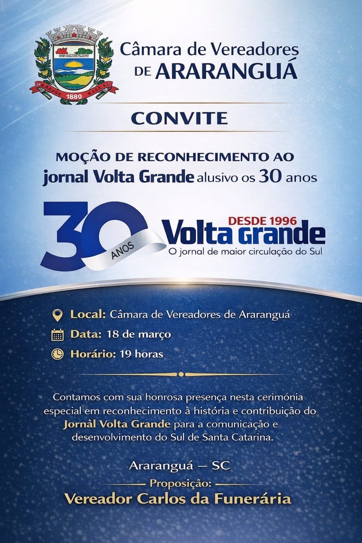 O Jornal Volta Grande será homenageado com uma moção de reconhecimento alusiva aos 30 anos de fundação. A solenidade acontece nesta quarta-feira, às 19 horas, na Câmara de Vereadores de Araranguá, e contará com a presença de autoridades, convidados e leitores.
