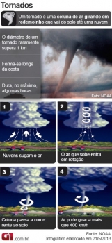 A escala de classificação de tornados começa em 65 km/h e chega a mais de 500 km/h. O F0 é o mais fraco e o F5 é considerado o mais forte. “Pelas características dos estragos e pela intensidade dos ventos, este deve ficar entre F2 e F3”, disse Mamedes Luiz Melo, meteorologista do Inmet Brasília.