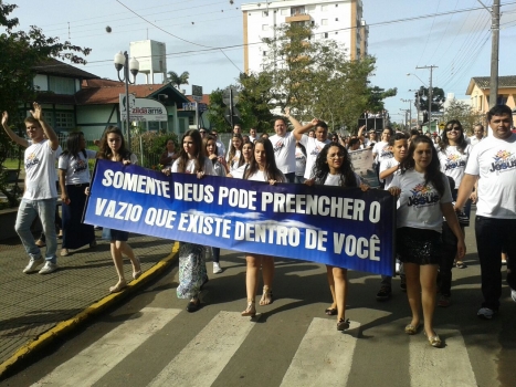 Forquilhinha- Religiosos de várias religiões evangélicas fizeram uma caminhada pela avenida 25 de julho em direção ao Centro de Eventos, onde um palco e centenas de cadeiras esperavam pelos fiéis. De camisetas brancas e identificadas com o movimento e Munidos de faixas e cartazes, a maioria jovens cantavam em voz alta. Uma das faixas dizia “SÓ DEUS PODE PREENCHER O VAZIO QUE TEM DENTRO DE VOCê”!