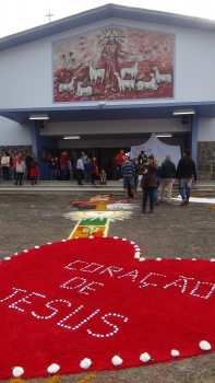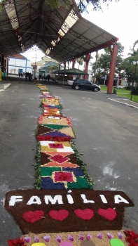 Forquilhinha- Desde a madrugada, fieis de várias comunidades e bairros do município vieram ao centro munido de produtos entre eles, borrão de café, serragem, flores, casca de arroz, flores, tinta e muitas outras coisas. Tudo para deixar bonito o tapete de Corpus Christi, onde após a missa os padres com a eucaristia consagrada, simbolizando o Cristo vivo passa pelo tapete enquanto os fiéis acompanhavam com orações e musicas.