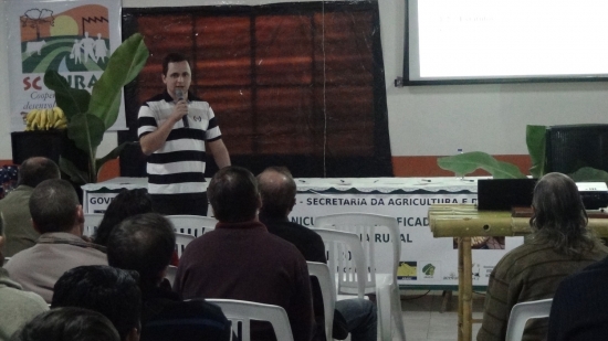 Santa Rosa do Sul- O evento aconteceu nesta quinta-feira na comunidade de Novo Horizonte, uma das comunidades produtoras de banana do município. Atualmente na região os municípios de Santa Rosa do Sul e Jacinto Machado são os maiores produtores de banana branca e caturra. O 1º Seminário foi organizado pela Epagri, Cidasc e prefeitura municipal de Santa Rosa. Cerca de 200 produtores participaram do evento, eles que estão organizados em seis Associações de Produtores, o que facilita a comercialização. Segundo os organizadores o objetivo do encontro é difundir e demonstrar a importância da Certificação Fitossanitária na cultura da banana no Sul do Estado, proporcionar conhecimentos técnicos atualizados e promover a integração dos produtores. Prefeito Nelson Oliveira de Santa Rosa do Sul participou do evento e falou do apoio que a prefeitura tem oferecido aos produtores de seu município com estradas e maquinas cedidas.