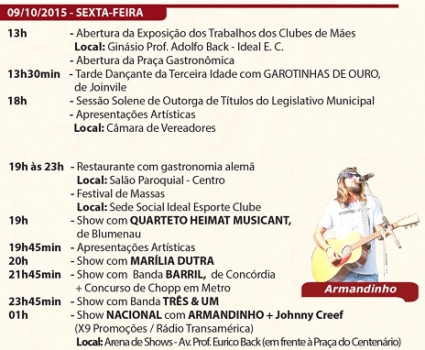 As 19 horas sessão solene na Câmara Municipal, 11 personalidades serão homenageadas com Títulos honoríficos de cidadão benemérito ou honorário e instituições de mérito, o evento faz parte da programação da Heimatfest . Os homenageados são: Ex-prefeitos Nelson Da Soler e Paulo Hoepers. Deputados e ex-deputados Esperidião Amim, Joares Ponticelli, Valmir Comim e Julio Garcia. Também serão homenageadas as empresas: KF artefatos de cimento, Cervejaria Santa Catarina, Mania de Crescer Ltda, Móveis Correia Back e Tiscoski distribuidora comercial.