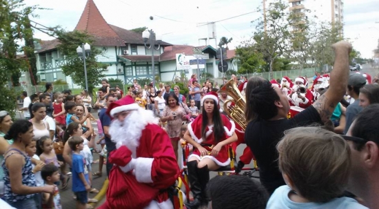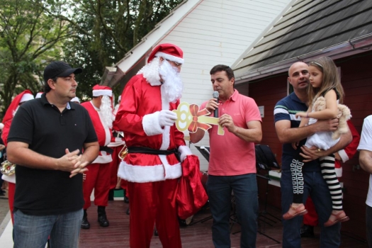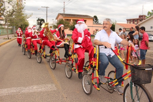 Diferente de outros Natais, Papai Noel chegou a Praça dos Imigrantes Alemães na tradicional bicicleta centopeia este ano em Forquilhinha. Acompanhado da Banda de Papai Noel, fez a alegria de crianças e adultos. Após uma rápida entrega da chave da cidade pelo Prefeito Lei Alexandre, o público apreciou apresentações da Banda de Papai Noel, Coral Encantos do Futuro e Banda Municipal de Forquilhinha. O evento é uma parceria com a Câmara de Dirigentes Lojistas (CDL). Diversos pontos da cidade estarão iluminados com reaproveitamento de materiais de outros anos e parcerias com empresas.