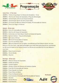 Segundo Alirio Bilésimo, Presidente da Aditália (responsável pela organização da Festa), a programação esta bastante atrativa e que tem como objetivo principal Valorizar a cultura Italiana. Além disso na programação também terão atrações religiosas bem como a Missa em memória a Frei Egidio que será celebradapor Dom Moacir Gechi, comemorando também os 80 anos do Bispo e os 50 anos de Sacerdócio de Frei Jose Milanez e Jose Flech. Acompanhe a programação completa.