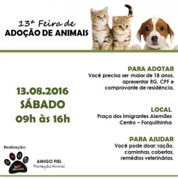 No próximo sábado (13), a Associação Amigo Fiel proteção animal de Forquilhinha estará realizando mais uma feira de adoção, esta é a décima terceira edição, será realizada na Praça dos imigrantes alemães, no Centro de Forquilhinha a partir das 9h e que tem como objetivo principal conseguir ótimos lares e definitivos para os animais se sentirem amados para que possam sair dos lares temporários. De acordo com a Presidente da associação, Morgana Hoepers, em todas as edições das feiras já foram adotados em media 100 cães e 30 gatos. “ Essa feira é muito importante pois esses animais muitas vezes resgatamos das ruas, tratamos e colocamos em lares temporários, só que as pessoas não podem cuidar por algum motivo e por isso então organizamos essas feiras para uma adoção responsável” Conta Morgana