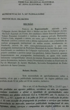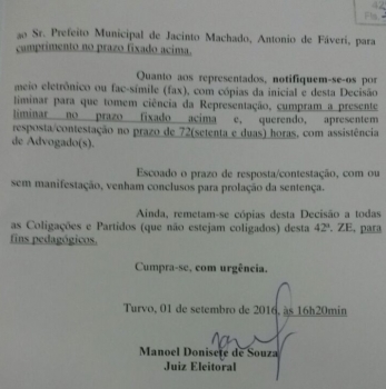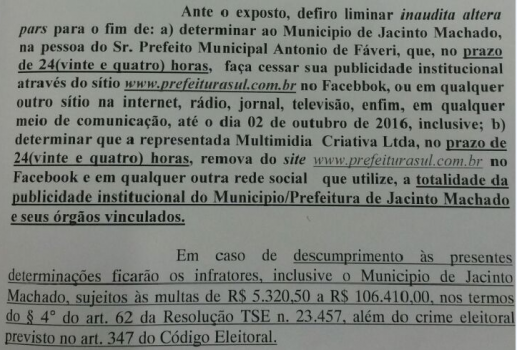 Jacinto Machado- O Juiz da Comarca de Turvo, Dr. Manoel Donisete de Souza, determinou através de uma liminar na data do 01 de setembro que o prefeito de Jacinto Machado, Sr. Antônio de Favere retire urgente do ar do site www.prefeiturasul.com.br. Segundo a advogada Fernanda Recco autora da representação, o site que mostrava propaganda institucional da prefeitura, favorecia o candidato a prefeito que o mesmo apoia (Adelor e Adelino), já que os mesmos apareciam nas propagadas inseridas nas redes sociais e Adelor Emerich é o atual Vice-prefeito. O Juiz deu 24h para que a prefeitura e a empresa Multimidia Criativa Ltda retirasse do site, do facebbok, ou qualquer outro meio de comunicação até a data do dia 02 de outubro, sob pena dos infratores pagarem multa de R$ 5.320,00 a R$ 106.410,00, além do crime eleitoral previsto no art. 347 do código eleitoral. Os autores cumpriram imediatamente e não está mais no referido site, ou seja cumpriram a determinação judicial.
