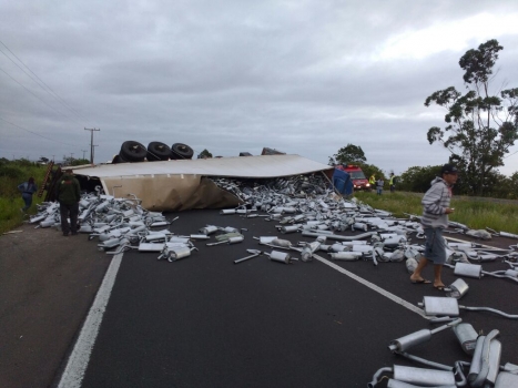 Um tombamento de uma carreta carregada com milhares de peças de surdinas por volta das 6:00 desta-sexta feira deixou a BR 101 totalmente interditada sentido Norte/Sul. O acidente aconteceu na localidade de Piritú, divisa entre os municípios de São João do Sul e Passo de Torres no extremo sul de SC. Após quarenta minutos com a chegada da Polícia Rodovária Federal, foi improvisada uma passagem por uma das laterais junto a uma granja de arroz, porém somente para veículos de pequeno porte. Para caminhões continua interditado.