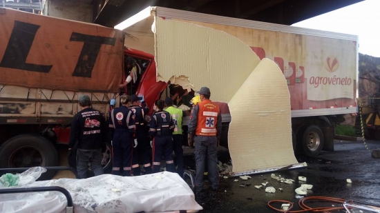 Sombrio- Um grave acidente envolvendo um caminhão da empresa Agroveneto e uma carreta da transportes Darolt parou o transito no sentido Sombrio a Santa Rosa, quase embaixo do viaduto do cemitério, por volta das 6h. Com relação ao estado de saúde do motorista as noticias ainda são destorcidas, estaremos atualizando a matéria assim que obtivermos mais informações. Policia e bombeiros estão no local retirando o motorista do caminhão que bateu na traseira da carreta.