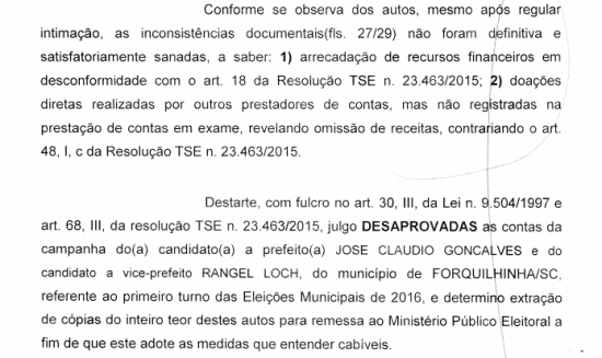 Forquilhinha- A juíza da 98ª Zona Eleitoral de Criciúma, Paula Bptke e Silva, deferiu no ultimo dia 26, pela rejeição das contas de campanha do candidato a prefeito José Claudio Gonçalves o Neguinho (PSD) e do seu vice Rangel Loch (PSDB). No teor da decisão ela cita o que levaram a rejeição das contas foram: Arrecadação de recursos financeiros em desconformidade com o artigo 18 da resolução do TSE e doações diretas realizadas por outros prestadores de contas, mas não registradas na prestação de contas em exame, revelando omissão de receitas, contrariando o artigo 48 da resolução do TSE. Nossa reportagem não conseguiu falar com os ex-candidatos citados, o que faremos até nossa edição impressa.