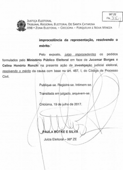O vereador Jucemar Borges e a servidora pública Celina Ronchi foram julgados inocentes de um processo de investigação judicial eleitoral que estava em andamento há alguns meses em Forquilhinha. o vereador colocou um sua rede social um desabafo e agradeceu a todos que acreditavam que ele era inocente. "A maldade chegou ao final fomos julgados e inocentados pela mão do homem, mas a justiça de Deus foi feita está a reposta para uma pessoa que sobe em altar de uma igreja para pregar a palavra de Deus, sendo que não coloca em prática de seu dia dia, mas rezo para Deus te mostrar o Caminho certo e não julgue sem saber o que fala, seja verdadeiro, humilde e não deixe se levar por ambições" Declarou o vereador.