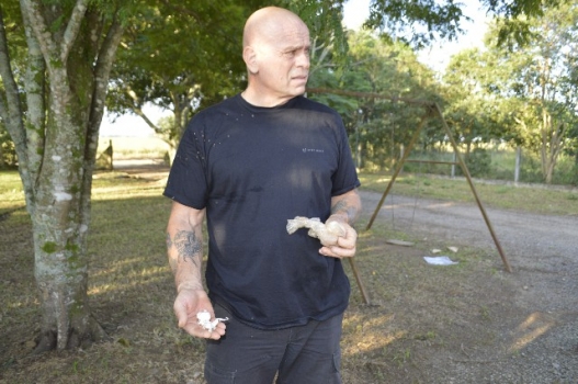 O delegado Jorge estendeu as buscas aos arredores da residência e em uma plantação de milho, num buraco demarcado, ele encontrou mais cinco petecas de cocaína em baladas e prontas para venda, iguais às que foram apreendidas no cano do banheiro. “Tínhamos a informação de que parte da droga estaria escondida foram da casa e ao ver um rastro, segui as pegadas, localizando parte da cocaína”, ponderou a autoridade policial.