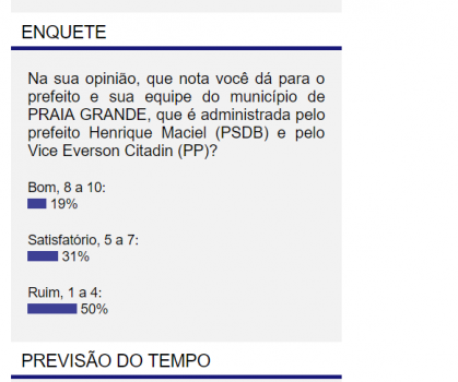Praia Grande- Dando continuidade as enquetes que estão sendo realizadas através dos internautas no site do Jornal Volta Grande, onde ficou uma semana em atividade, tivemos mais um município onde centenas de pessoas responderam. A pergunta é padrão, com 3 opções. “Na sua opinião, neste, um ano e meio, que nota você dá para o prefeito e sua equipe do município de Praia Grande que é administrada pelo prefeito Henrique Maciel (PSDB) e Everson Citadin (PP) ”.
