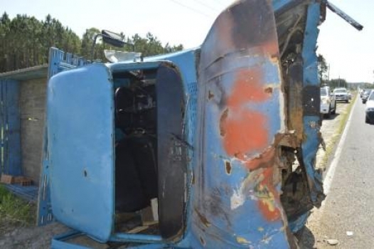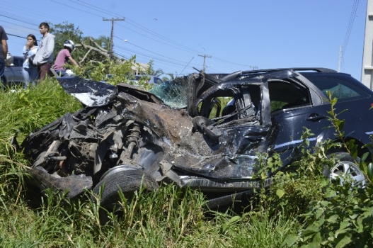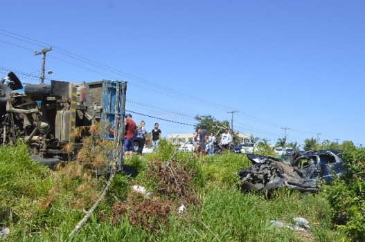 Com o impacto da colisão que aconteceu próximo ao trevo das praias, a caminhonete tombou e o automóvel parou no barranco do outro lado da rodovia.