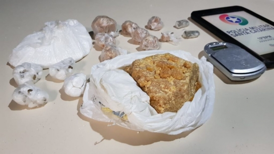 Imediatamente viaturas foram ao local indicado, na Rua Manoel Verissimo Soares e localizaram uma quantidade significativa de crack e cocaína. Conforme o Sargento Nazário do 19º BPM, com a possibilidade de haver mais entorpecentes enterrados no local, foi chamado apoio do canil K9 de Criciúma. “Quando chegamos no local e iniciamos a varredura encontramos uma sacola enterrada ao lado do muro contendo 317 gramas de substância semelhante a crack e 208 gramas de substancia semelhante a cocaína. Ao chegar o Canil K9 de Criciúma, a cadela “Flecha” verificou todo o terreno, não sendo localizado mais drogas”, ponderou o Sargento.
