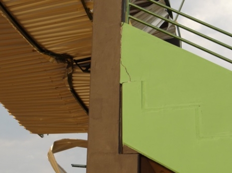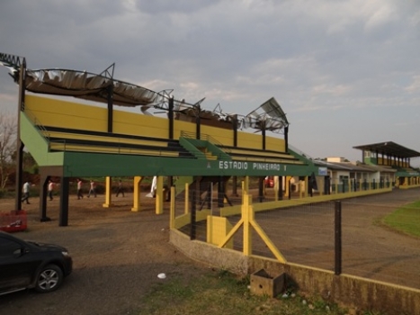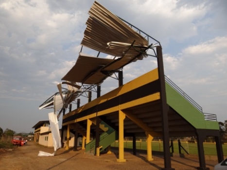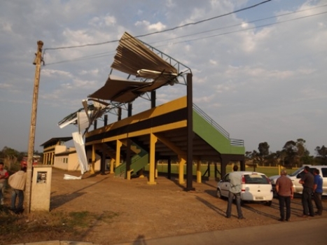 O forte vento que atingiu toda a região na tarde de quinta-feira (22), fez estragos no Estádio do Pinheirão, no Bairro Ouro Negro. O telhado galvanizado de uma das arquibancadas, entortou para trás, quase vôou, e ficou pendurado na estrutura. A empresa responsável pela recuperação esteve no local na mesma tarde para retirar o telhado danificado. Algumas rachaduras chegaram a aparecer na arquibancada depois do vento, mas o engenheiro da prefeitura que estava no local afirmou que isso não compromete a construção.