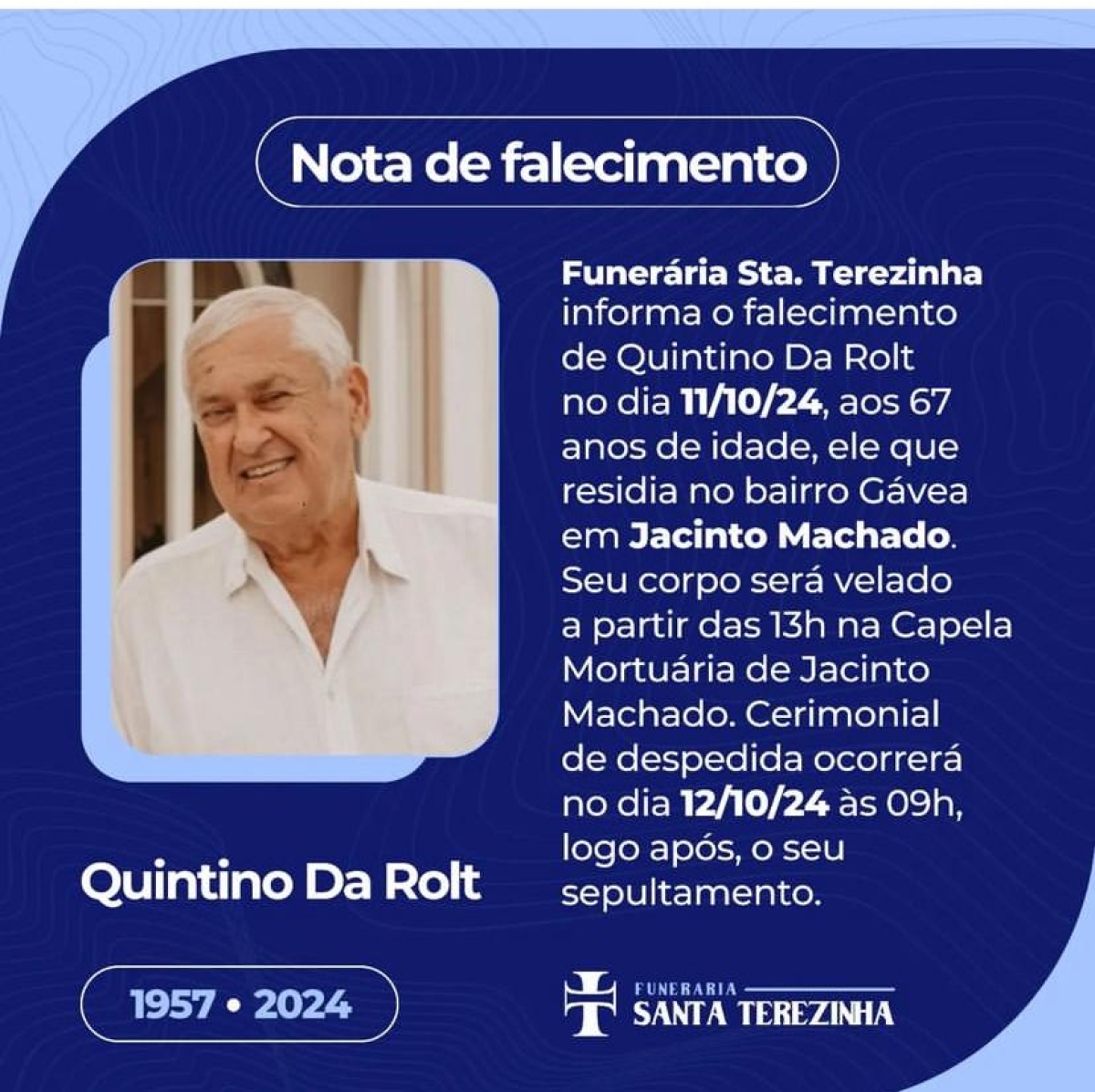 Faleceu na manhã desta sexta-feira (11), o ex-vereador Quintino Darolt, ele tinha 67 anos e residia no bairro Gávea em Jacinto Machado. Ele foi também por vários anos Gerente da Cejama. Seu corpo será velado a partir das 13h na capela mortuária de Jacinto Machado. Cerimonia de despedida será amanhã a partir das 9h e logo após sepultamento.