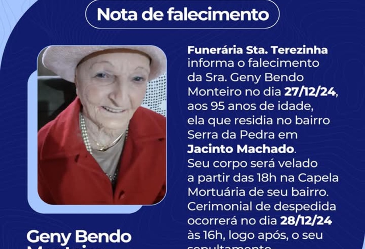 Jacinto Machado- Faleceu ontem aos 95 anos de idade, a dona Geni Bendo Monteiro. Ela residia na comunidade de Serra da Pedra e será sepultada hoje dia 28 as 16hs sob a responsabilidade da funerária Santa Terezinha.