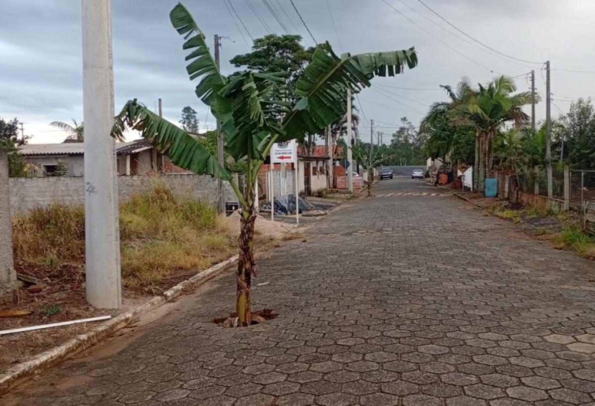 Segundo os moradores, o problema já foi comunicado à prefeitura há mais de dois meses, mas até agora nenhuma solução definitiva foi tomada. Cansados de esperar por providências, eles decidiram agir de forma criativa para chamar a atenção das autoridades: plantar bananeiras dentro dos buracos.