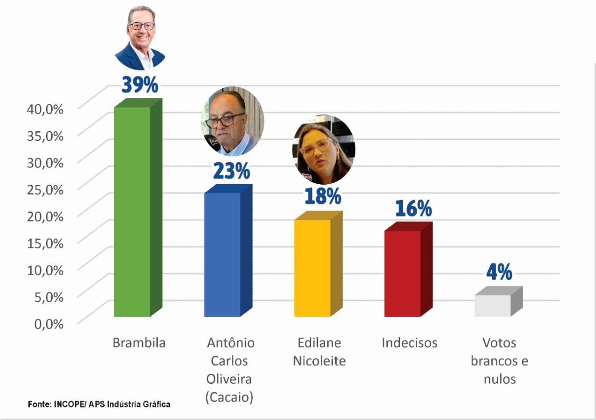 De acordo com os dados coletados, Brambila conta com 39% das intenções de voto, seguido pelo ex-prefeito Antônio Carlos Oliveira, conhecido como Cacaio (PP), que registra 23%. A vereadora Edilane Nicoleite, do União Brasil, aparece em terceiro lugar, com 18% das intenções. Os votos brancos e nulos somam 4%, e os indecisos ainda são 16%.