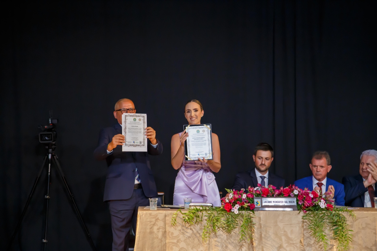 A prefeita Ângela Ghislandi e o vice-prefeito Edésio Spilere assumiram o compromisso de liderar o executivo municipal pelos próximos quatro anos, prometendo dar continuidade aos projetos que impulsionam o desenvolvimento de Nova Veneza e fortalecer áreas como saúde, educação e turismo.