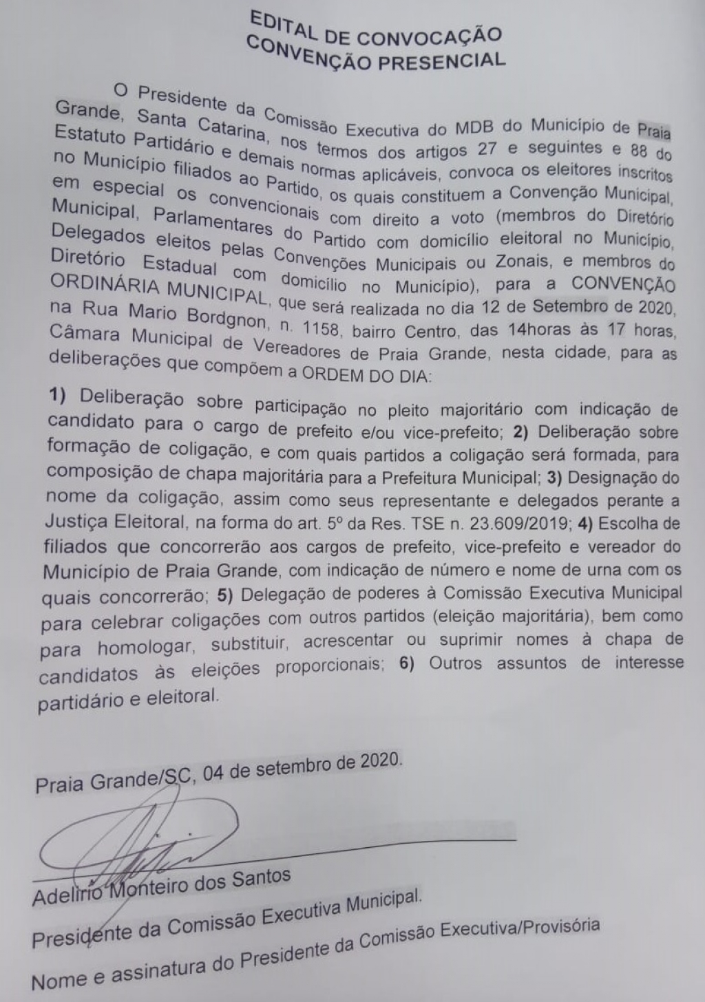 Edital de Convocação MDB de Praia Grande