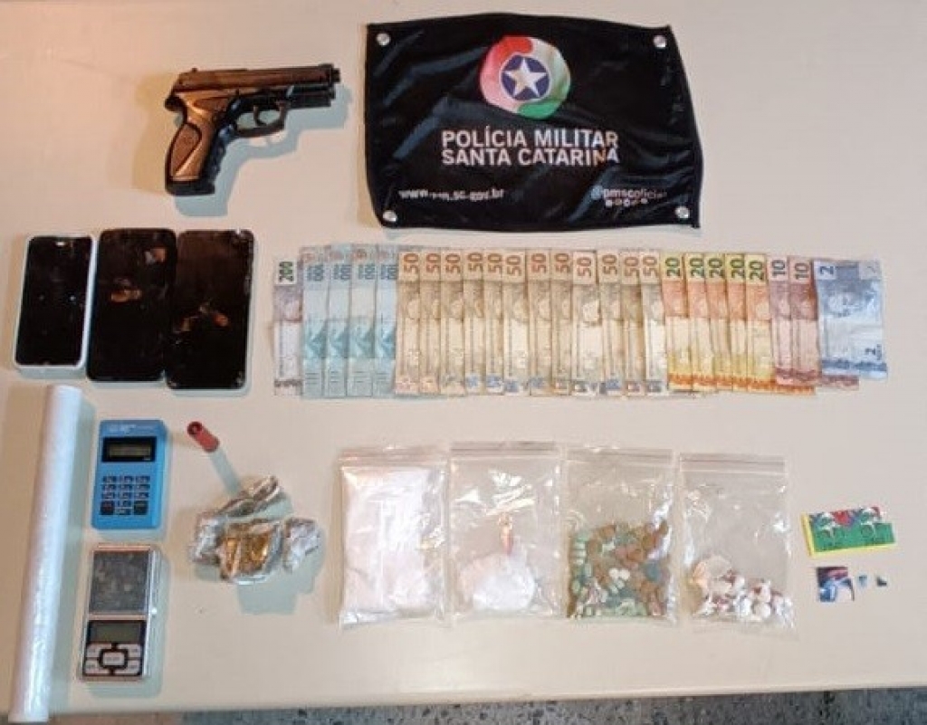A Polícia Militar (PM) apreendeu 60 gramas de maconha, 103 gramas de cocaína, 67 comprimidos de ecstasy, 65 micropontos de LSD, uma munição calibre 32, um simulacro de arma de fogo, balança de precisão, um celular, uma máquina de cartão e R$ 1.322, em Forquilhinha. A ocorrência foi registrada na madrugada desta quinta-feira, dia 5, na rua Pedro Bordignon, no bairro Santa Isabel. Um adolescente de 17 anos foi apreendido por ato infracional análogo ao tráfico de drogas.