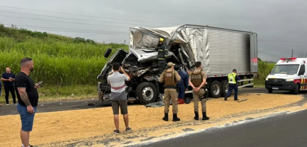 Segundo a CCR Via Costeira, o motorista do caminhão ficou ferido e preso às ferragens depois que o veículo que ele dirigia colidiu na traseira de outro caminhão. Além da ambulância da concessionária, duas viaturas do Corpo de Bombeiros e o Serviço Aeromédico atuaram no resgate da vítima.