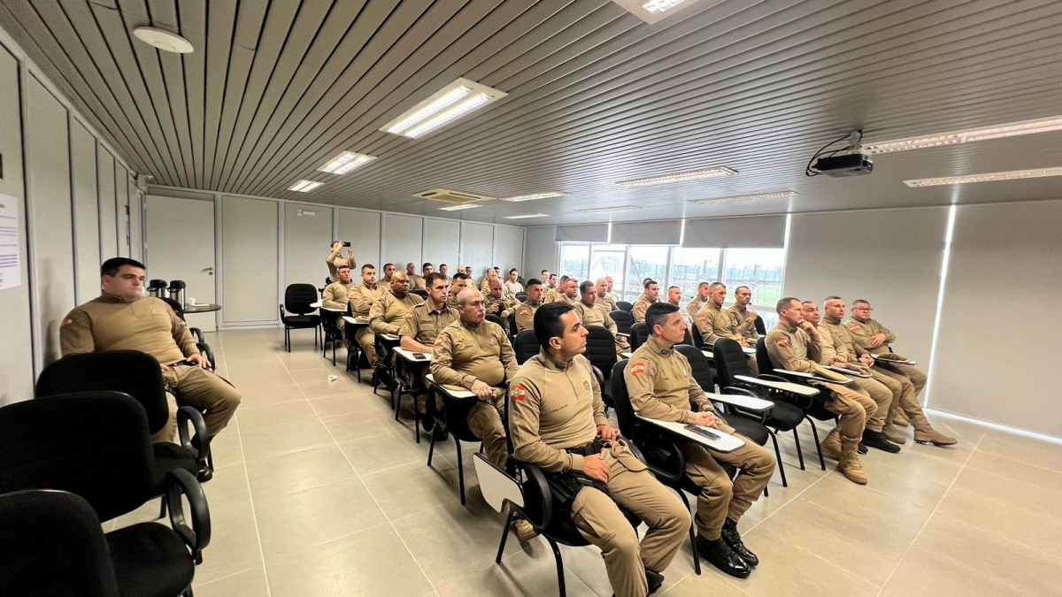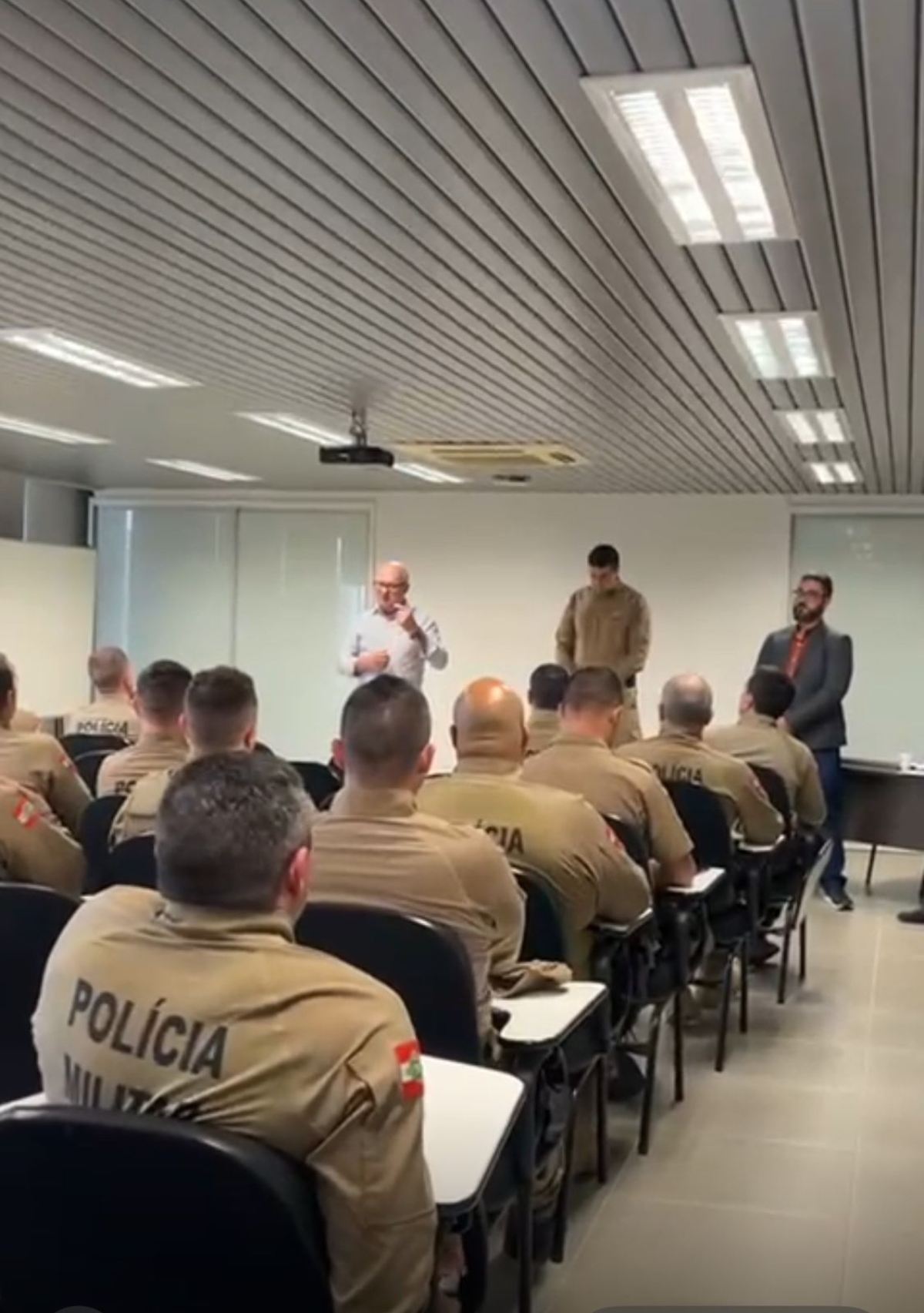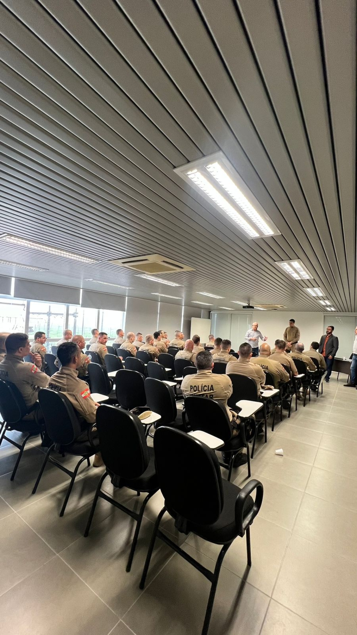 Policiais Militares estão reunidos na sala de treinamento da Coopera, na sede da cooperativa no bairro Santa Cruz, na tarde desta quarta-feira (25). uma palestra voltada para os integrantes da Polícia Militar da 4ª/9° BPM tem como objetivo oferecer orientações sobre as eleições de 2024 no município e conta com a participação de aproximadamente 40 policiais militares.