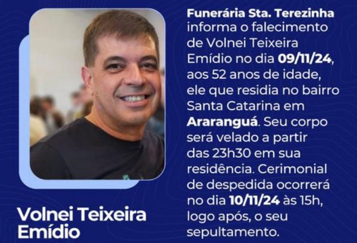 Morador do bairro Santa Catarina, em Araranguá, seu sepultamento sob a coordenação da Funerária Santa Terezinha será realizado neste domingo, dia 10, às 15h, ocorrendo logo após, seu sepultamento.